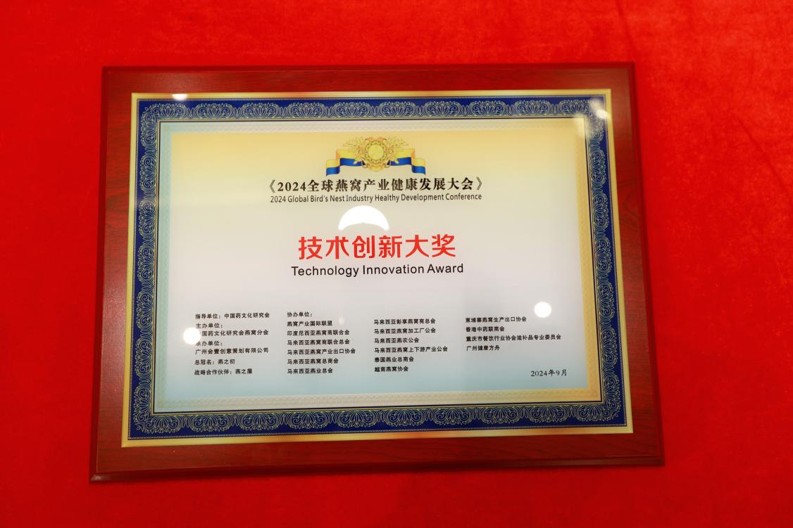 9月23日,在榜樣的力量一行業(yè)表彰盛典上,燕之屋憑借先進的創(chuàng)新引領(lǐng)力、卓越的產(chǎn)品競爭力、強勁的品牌影響力榮獲行業(yè)領(lǐng)軍品牌大獎、行業(yè)匠心品牌大獎、技術(shù)創(chuàng)新大獎,燕之屋創(chuàng)始人、執(zhí)行董事兼董事長黃健榮獲行業(yè)領(lǐng)軍人物;燕之屋傾情助力2024全球燕窩產(chǎn)業(yè)健康發(fā)展大會,進一步推動燕窩產(chǎn)業(yè)的創(chuàng)新發(fā)展,促進燕窩文化的傳承與交流,為行業(yè)的繁榮貢獻力量,獲頒《2024全球燕窩產(chǎn)業(yè)健康發(fā)展大會》戰(zhàn)略合作單位,并成為《2024全球燕窩產(chǎn)業(yè)健康發(fā)展大會》唯一指定碗燕即食燕窩品牌,燕之屋公關(guān)總監(jiān)楊航上臺領(lǐng)獎。