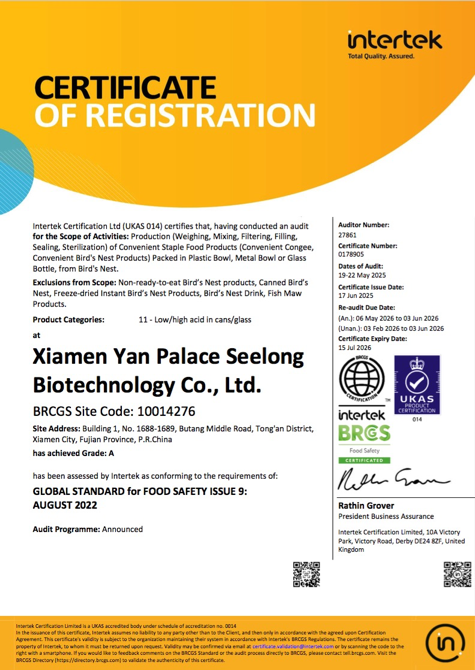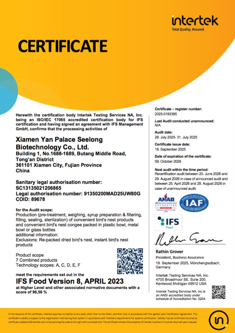 圖:燕之屋獲得BRC食品安全全球標(biāo)準(zhǔn)、IFS國(guó)際食品標(biāo)準(zhǔn)雙重認(rèn)證